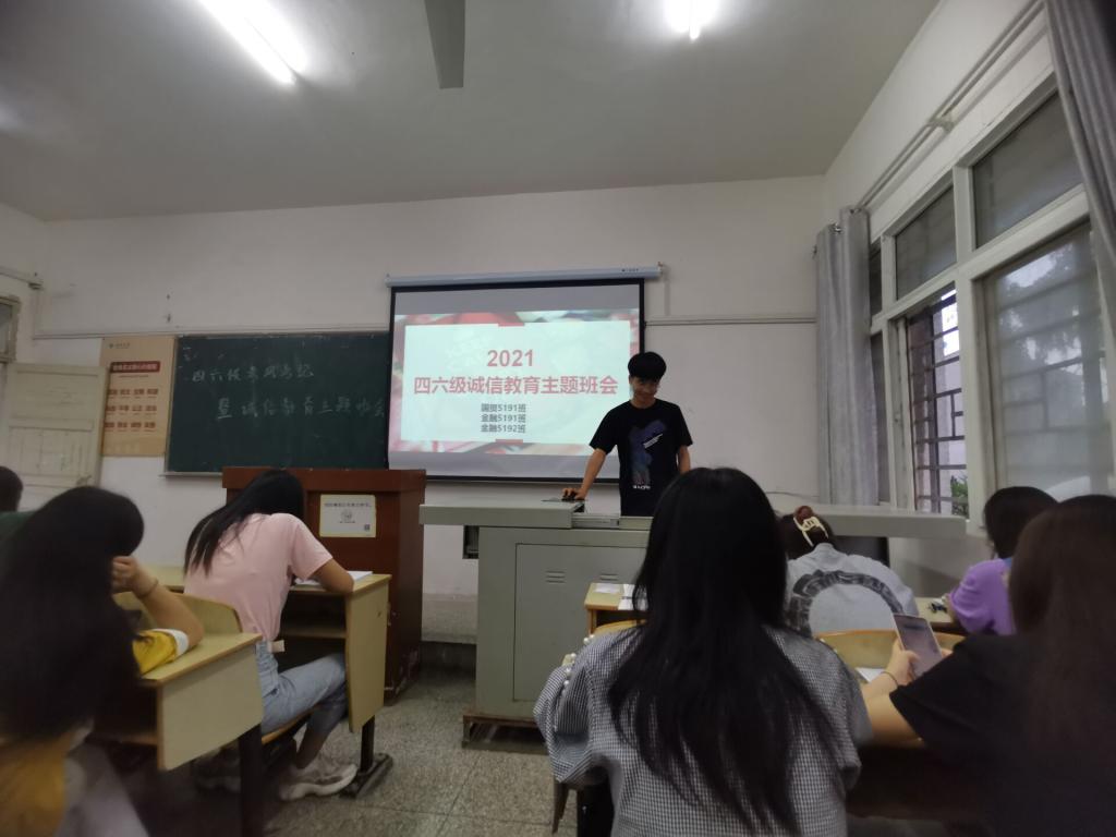 首先,主持人向同学们讲解英语四六级考试的考试时间、考试地点、考试必带品及考试中的规则。其次,主持人指出了考试作弊的严重性,强调树立道德之新风,立诚信之根基是当代大学生义不容辞的责任。最后,辅导员进行总结,希望同学们树立信心,珍惜机会,保持平稳的心态,通过不懈努力取得一个令自己满意的成绩。
