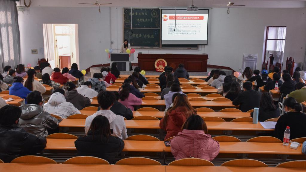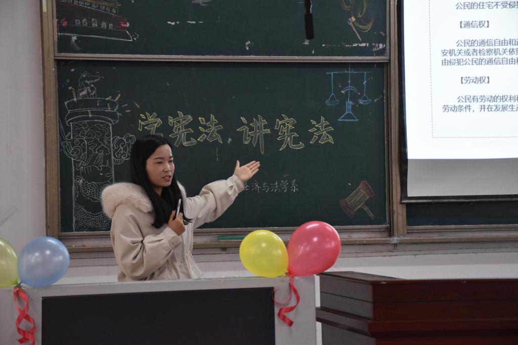 本网讯(学生记者 龚千惠 见习记者 陈燕妮 李雅雯)为弘扬宪法精神,在国家宪法日到来之际,本周五(12月3日)下午三点,经法系在4教300举行了以“学宪法,讲宪法”为主题的宪法宣传日讲座。本次讲座由法学教研室姜婷婷老师为同学们讲解宪法知识。辅导员卢佳智参加活动,经法系全体学生党员、学生会成员和各班学生代表参加活动,活动由法学教研室主任周密老师主持。