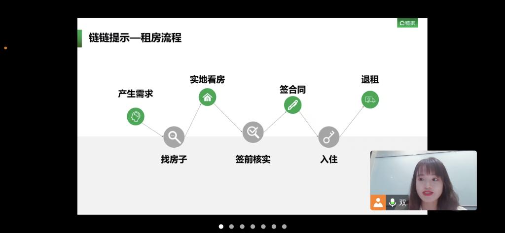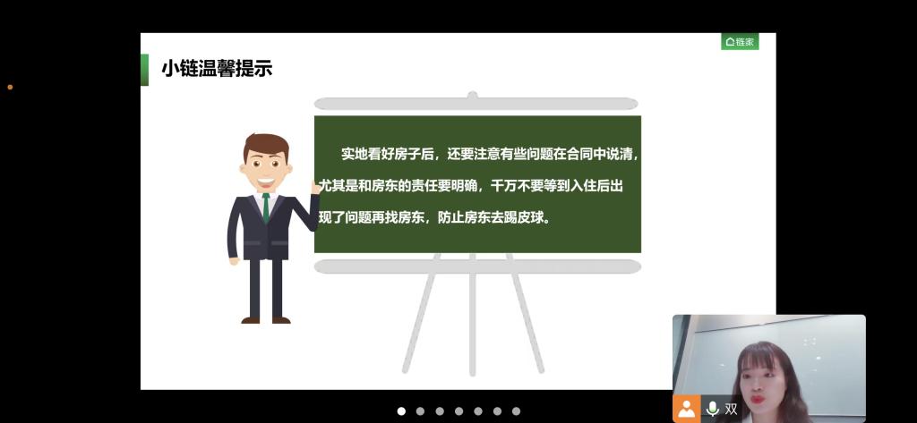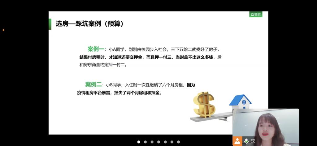 首先,史双双经理向同学们说明租房的正确流程,并结合近年来房屋租赁市场存在的问题,深入浅出地向学生们介绍了房屋租赁过程中常见的虚假房源骗取租金、低价诱惑、巧立名目乱收费、二房东克扣押金等九大陷阱。其次,史双双经理结合选房踩坑案例,警醒大学生一定要在租房前掌握租房过程中的一些专业名词。史经理温馨提示毕业生们:要实地看好房子后,注意合同内容,尤其是和房东的责任要明确,千万不要等入住后出现了问题再找房东,防止房东去踢皮球。最后,史双双经理也通过此次线上讲座为毕业生介绍了链家公司的企业文化和校园招聘,为毕业生提供了实习就业岗位,进一步加强了校企间的合作。