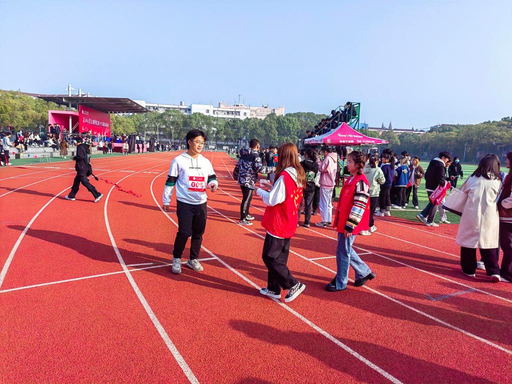 系部棚子下,志愿者提醒同学们签到,并为大家倒好热水,给予同学们冬日里的一丝温暖;主席台后,她们认真检录,核对运动员信息,对待工作一丝不苟;跑道上,红色身影更是随处可见,搀扶赛后体力不支运动员、安抚运动员情绪、为运动员们解惑等。冲锋号角随风起,田径健儿赛秋高,汗水在赛场上闪亮,青春在心底里珍藏。运动场上澎湃着青春悦动的气息,激荡着蓬勃向上的热情。而经法系志愿者服务队与经法系运动员们同在,为运动员们保驾护航是经法系志愿者服务队的职责与期望,看到经法系运动员们取得良好成绩,志愿者们自豪不已!