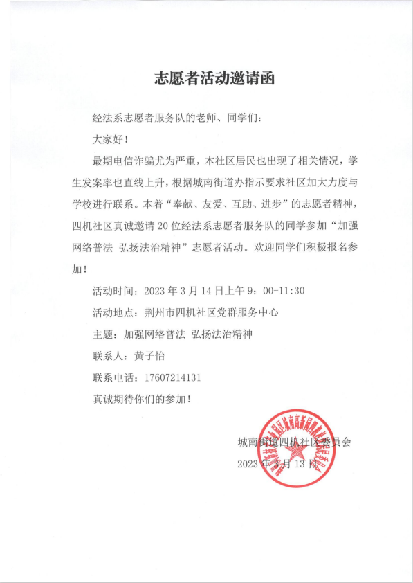 本次志愿活动志愿者们共同走近四机社区,协助社区做好普法宣传工作。在社区路上志愿者们手拿宣传册为老人宣传防诈骗知识,提高老人作为消费者的防范意识和法律意识。随后志愿者们在四机社区二楼会议室开展了普法知识讲座,为四机社区居民讲述相关法律知识和维权途径。然后跟随社区负责人入户宣传,分发普法宣传单。此次活动开展期间,经法系青年志愿者们以高昂的热情进行讲解,以认真的态度对待自己的工作,充分发扬了志愿者精神,展现了经法系学生的风采和责任担当。此次活动意义非凡,赢得了四机社区居民的一致好评。