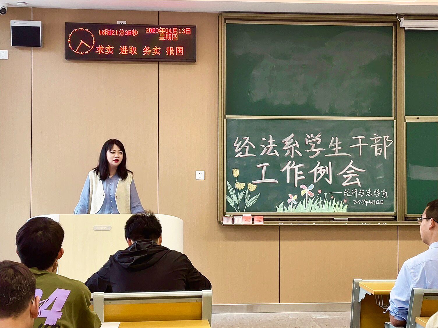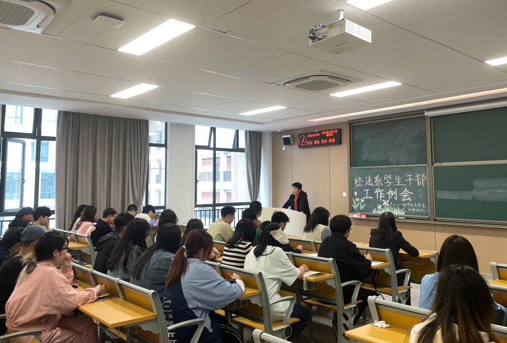 本网讯(见习记者 夏雪飞)为进一步加强经法系学生干部队伍建设,提高学生干部工作的积极性,增强责任意识。经济与法学系于4月12日16:00在C–317M教室召开了经法系学生干部工作例会。经法系党总支副书记杨杉杉、辅导员卢佳智、滕宋云、刘豪以及经法系各班班长,团支书,学习委员参与此次会议。