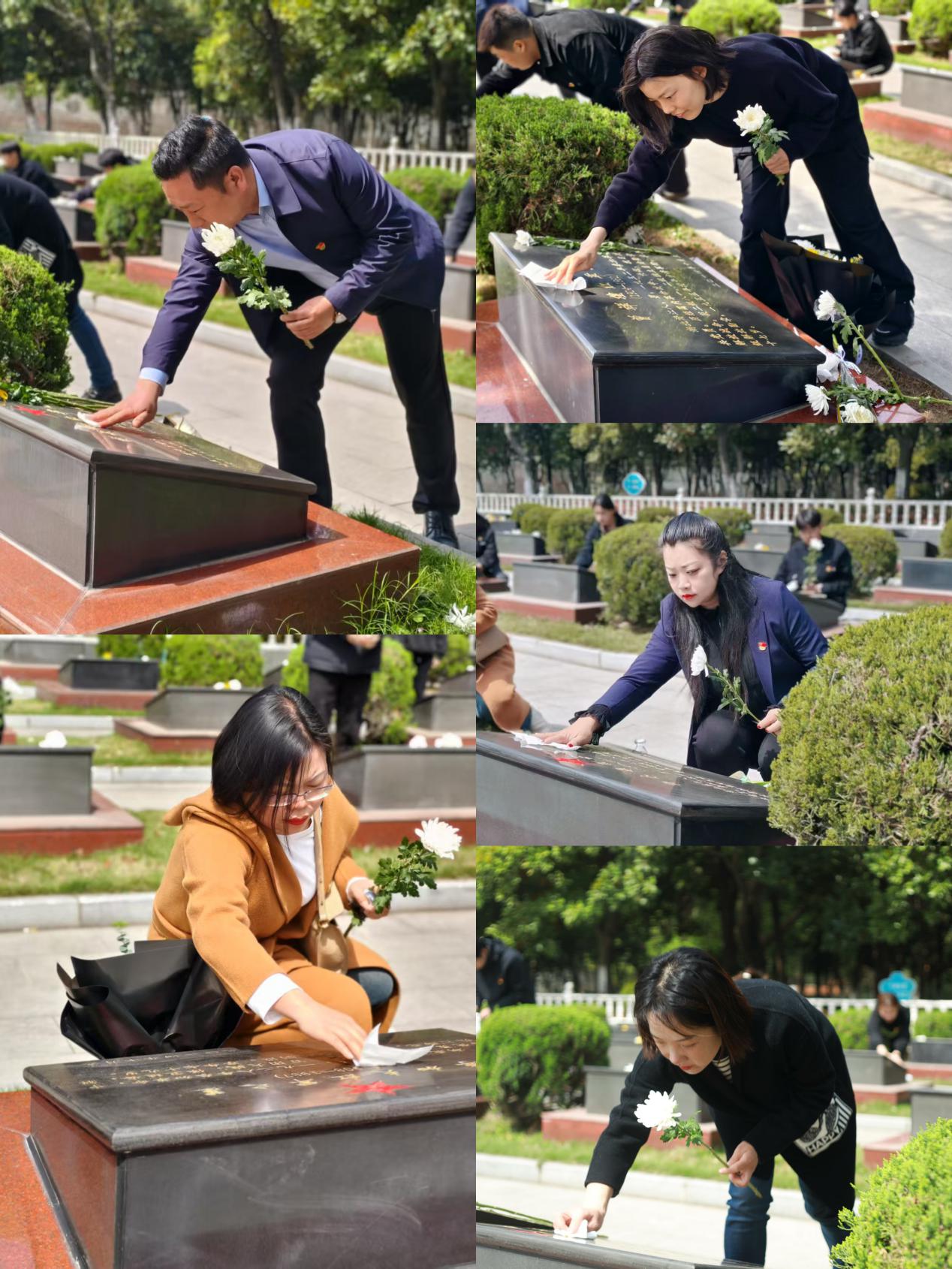 紧接着,全体人员怀着无比崇敬之情,缓缓走近烈士墓碑,轻轻擦拭碑身,感受着先辈们炽热的红色精神,随后虔诚地献上精心准备的花束。