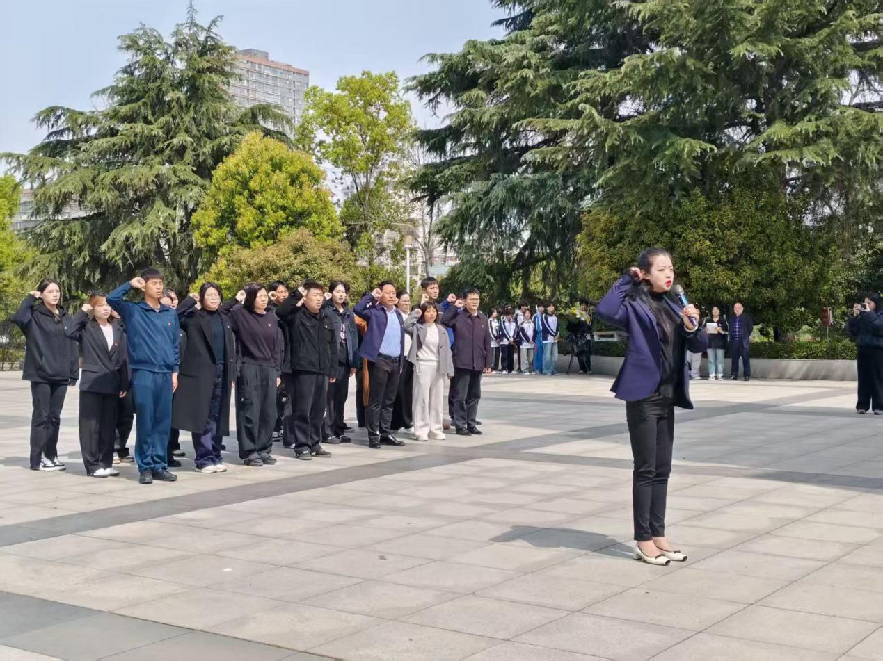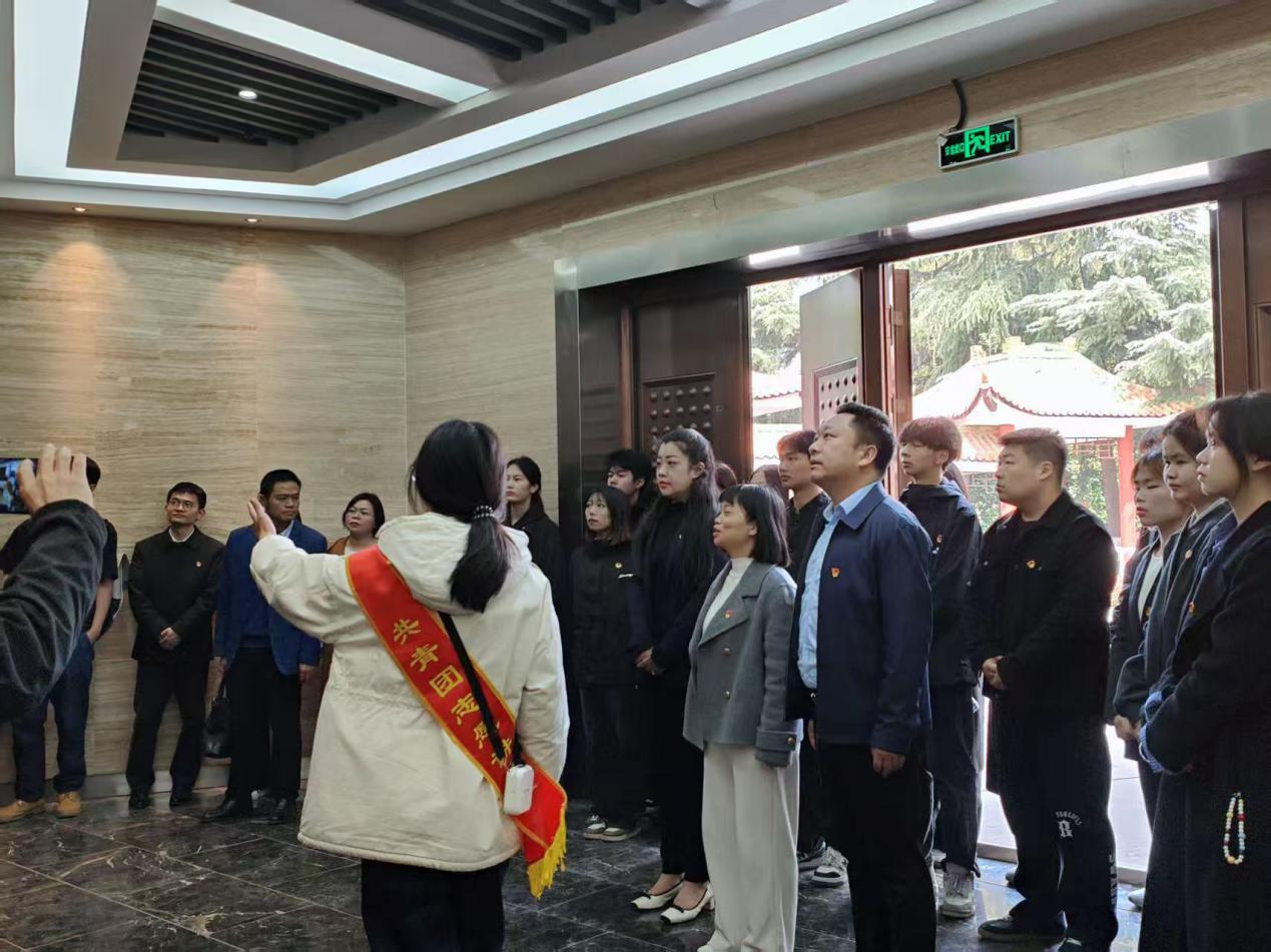 在巍峨耸立的烈士纪念碑前,全体参与者高高举起右拳,在党总支副书记杨杉杉的带领下庄严宣誓,重温入党誓词。那铿锵有力、掷地有声的誓言,在陵园上空久久回荡,淋漓尽致地彰显出赓续红色精神的坚定信念。