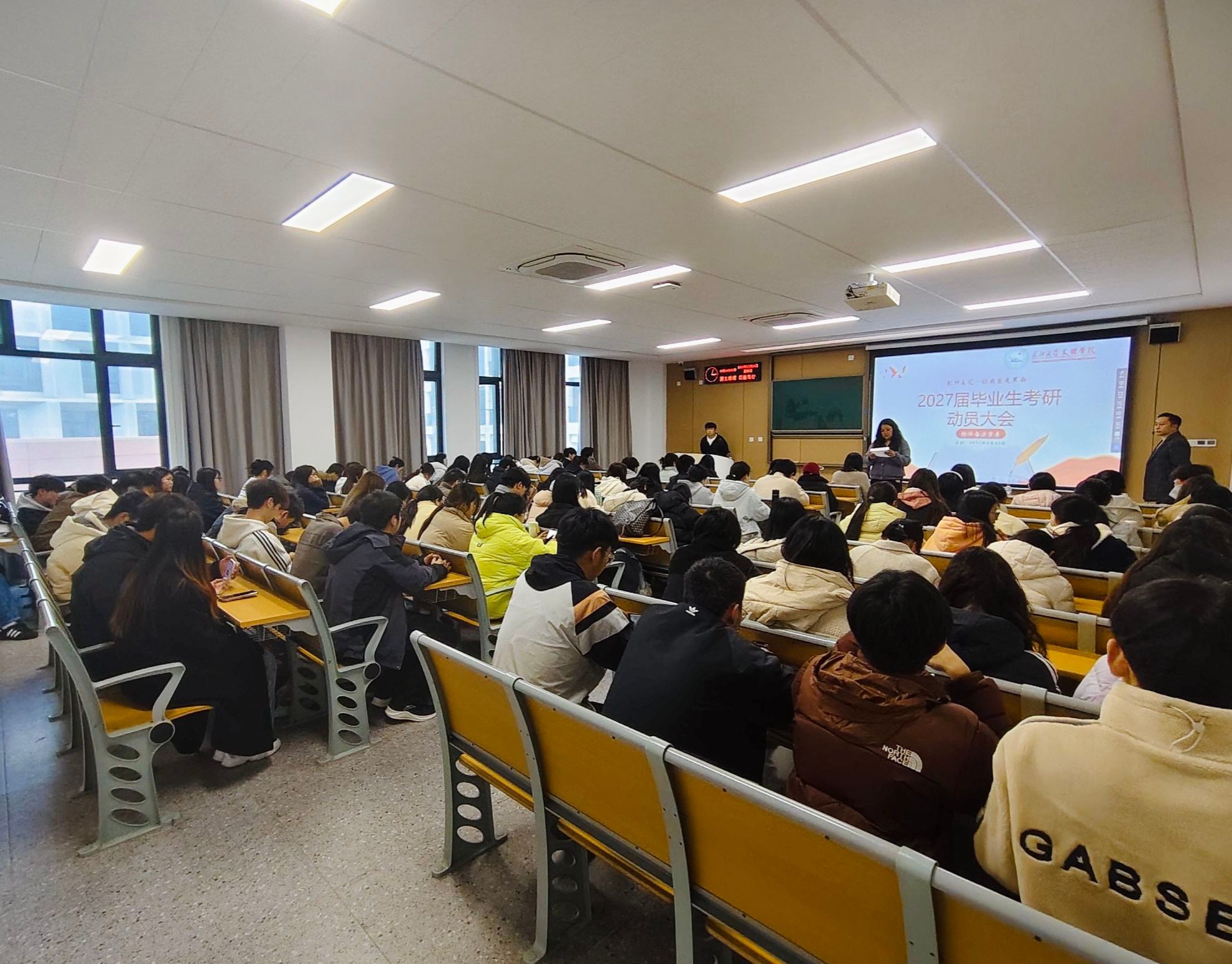 本网讯(见习记者:谭钱鑫)为促进经法系学生高质量充分就业,贯彻落实学院“两康一训”育人理念,3月26日下午,经法系在C-217、C-219教室隆重召开2027届毕业生考研动员大会。系领导班子成员,23级班主任出席动员大会。会议由辅导员卢佳智、刘曼莹分别主持。