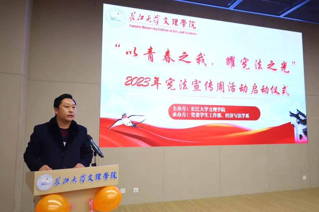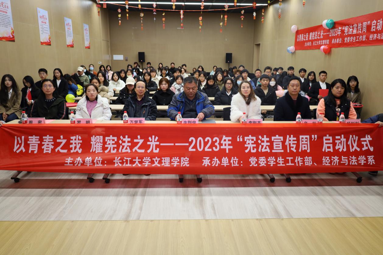 12月1日下午16:00在图书馆103报告厅举行“以青春之我,耀宪法之光”yl7703永利集团2023年宪法宣传周启动仪式。学院党委副书记李则俊、学生工作部部长李刚英、经济与法学系领导班子成员以及师生代表参加了此次启动仪式。仪式由经法系党总支书记辛裕主持。