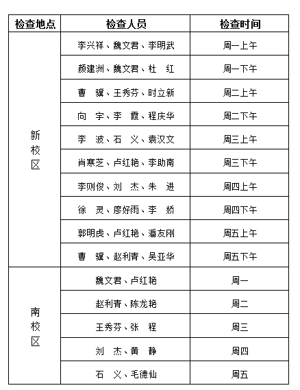2.教学单位应成立教学检查工作小组,制定检查方案,明确检查要求,并于8月28日下午前将本单位“开学教学检查安排”(内容包含检查领导小组、检查项目、检查方式、检查人员、听课安排等)报教务处。
