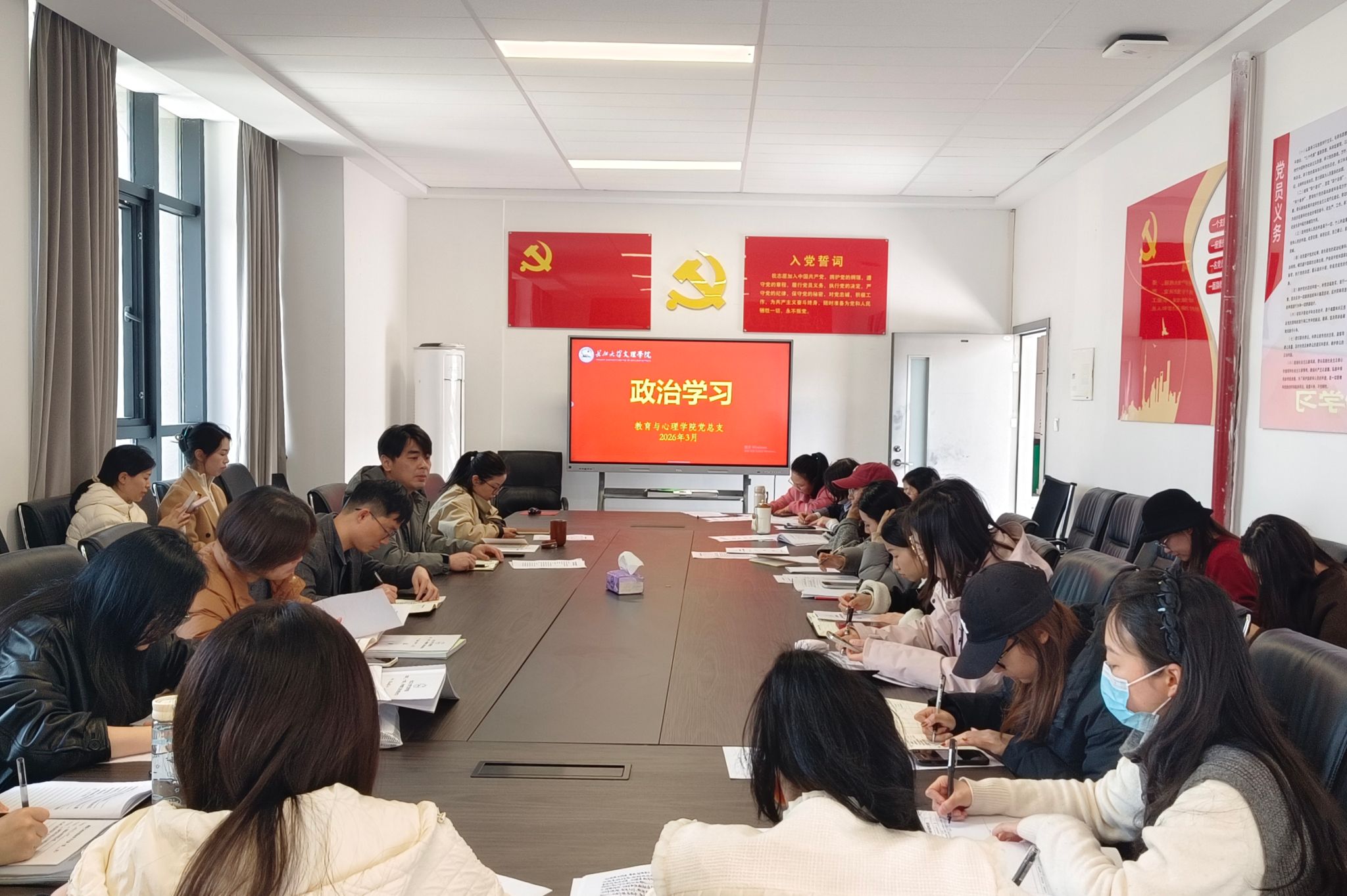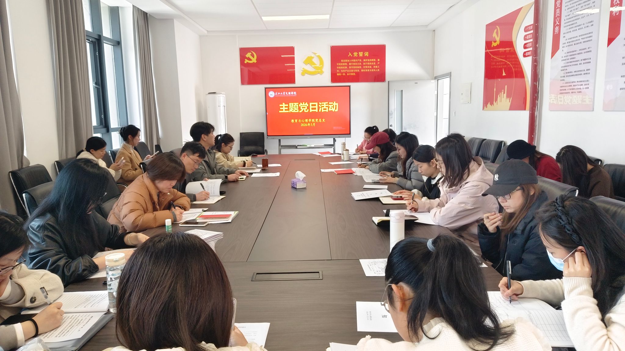 本网讯(通讯员 李嘉谊)3月12日下午,教育与心理学院在学院会议室开展3月份政治理论学习和支部主题党日活动。会议由党总支书记祝峰主持,全体教职工及学生党员参加。