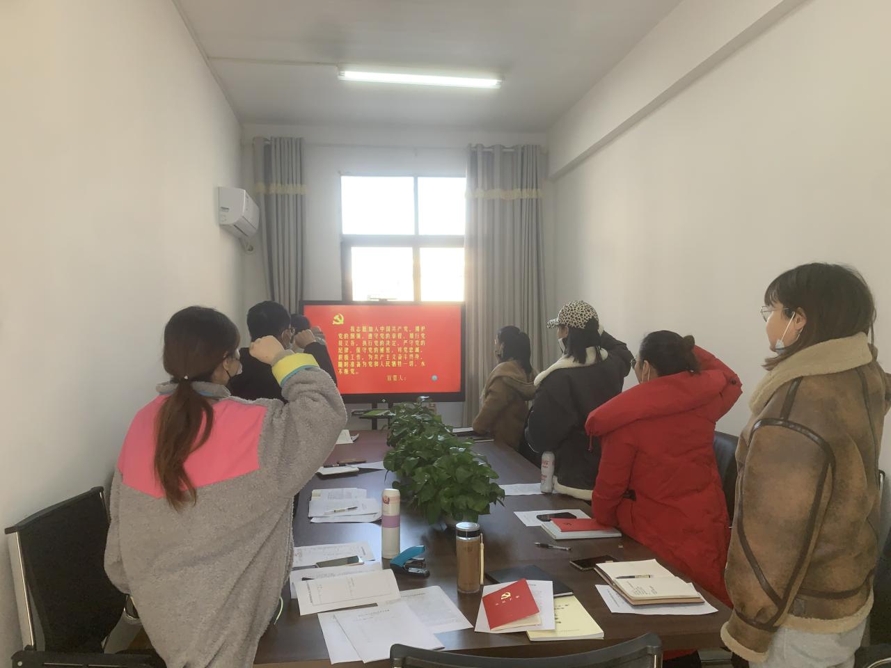 首先,全体教职工在梅曼曼的带领下,重温入党誓词;学习《中国共产党章程》第五章;学习习近平在中共中央政治局民主生活会上的重要讲话等内容。