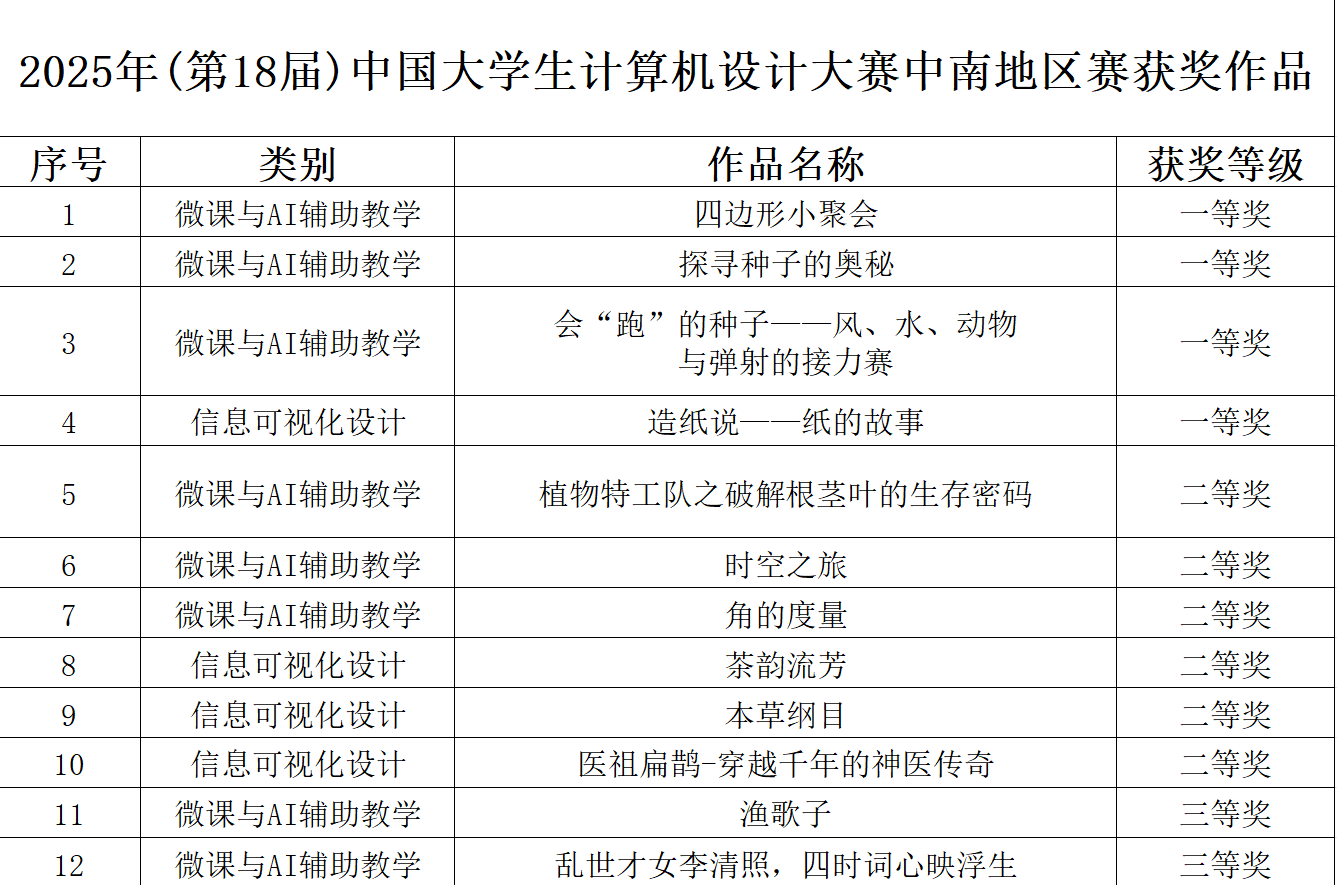 (通讯员 图文/蒲思怡) 近日,2025年(第18届)中国大学生计算机设计大赛中南地区赛公布竞赛结果。我院参赛学生在本次大赛中表现优异,获一等奖4项、二等奖6项、三等奖2项,其中一等奖中的“四边形小聚会”、“探寻种子的奥秘”两项作品凭借出色的创意与技术表现被推荐参加全国总决赛。