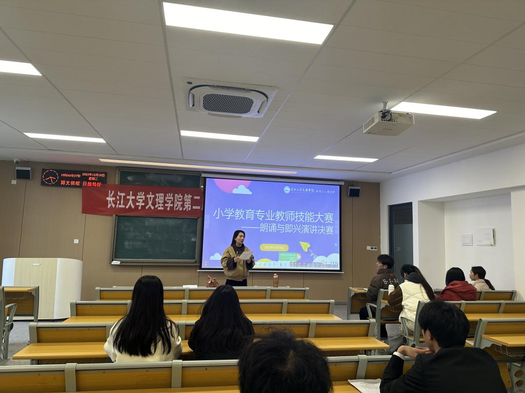 本网讯(通讯员赫诗雨)为加强学生师范专业素质能力,夯实语言技能,提升口头表达能力。12月19日下午两点,小学教育专业在教学楼C-217教室举行第二届师范生朗诵与即兴演讲比赛。教育与心理学院陈盈盈、人文与传媒学院张莹担任评委。