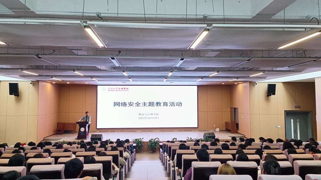 本网讯(通讯员柯浪)为提高青年学生的网络安全防护技能和自我保护能力,加强国家安全知识和网络安全知识的深度学习,教育与心理学院于10月19日在学术报告厅开展了一次网络安全主题教育活动。教育与心理学院党总支书记祝峰,副书记梅曼曼,辅导员薛兰慧及200余名学生参与会议。