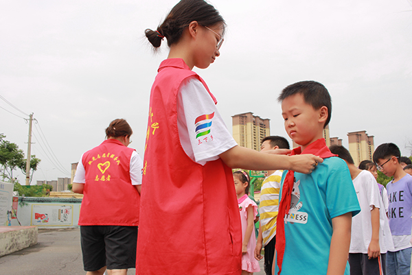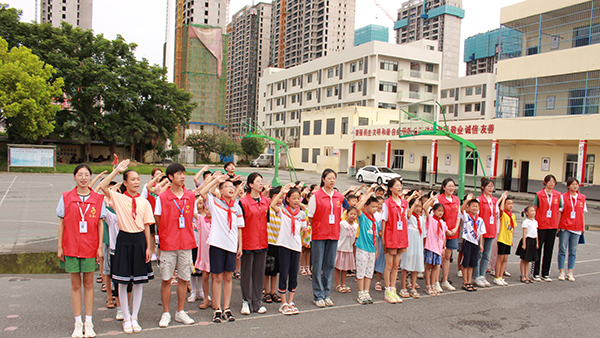 本网讯(通讯员 程欣悦)近日,教育与心理系微光志愿者服务队“七彩假期·三下乡”暑期社会实践团队来到沙市区立新乡红门路小学,开启了近两周的支教生活,围绕思想引领、身心健康、快乐学习、文明生活、文化传承、艺术素养、科技创新七大主题开展志愿服务活动。7月5日上午,微光志愿者服务队在红门路小学开展“同怀爱国心,共升一面旗”庆祝中国共产主义青年团成立100周年主题升旗仪式,志愿者代表及红门路小学“七彩假期”夏令营学生共120余人参加仪式。
