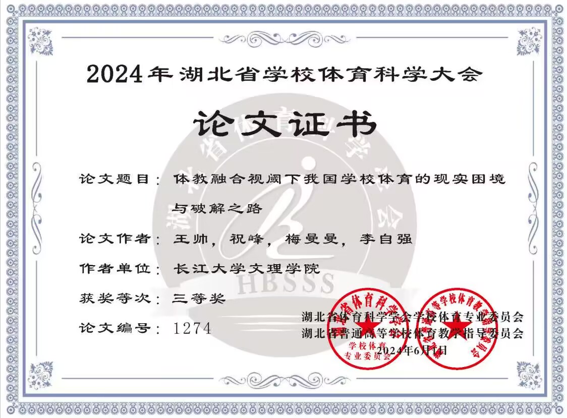 据悉,本次大会共收到来自全省各有关单位和个人报送的论文1741 篇,经论文学术不端系统检测、人工筛查和专家评审等程序,录取论文1082 篇,我校教育与心理学院教师王帅、祝峰、梅曼曼等人撰写的论文《体教融合视阈下我国学校体育的现实困境和破解之路》获三等奖。