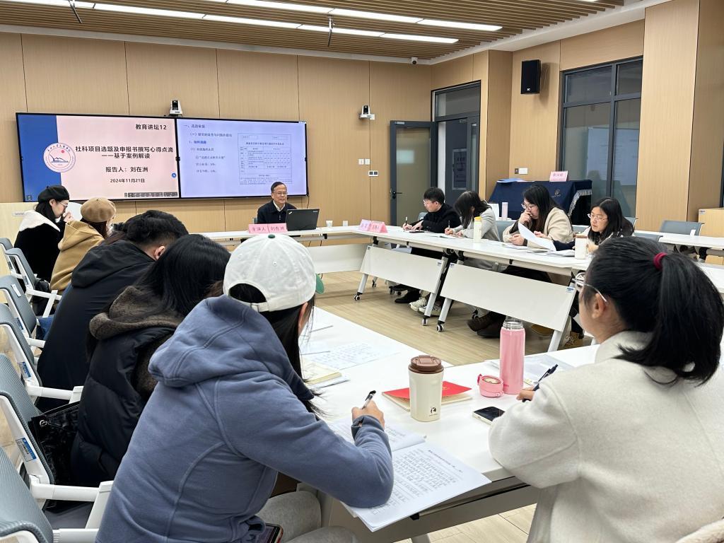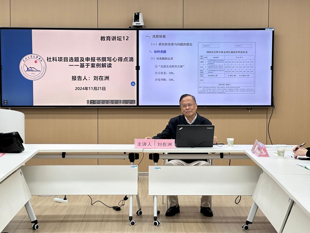 (通讯员 图/刘娅 文/骆飞莉)11月21日下午3时,刘在洲教授受邀以“社科项目选题及申报书撰写心得点滴一一基于案例解读”为题,在实验楼408教室为我院教师作报告。本次活动由教育与心理学院院长徐霄主持,全体专任教师聆听了讲座。