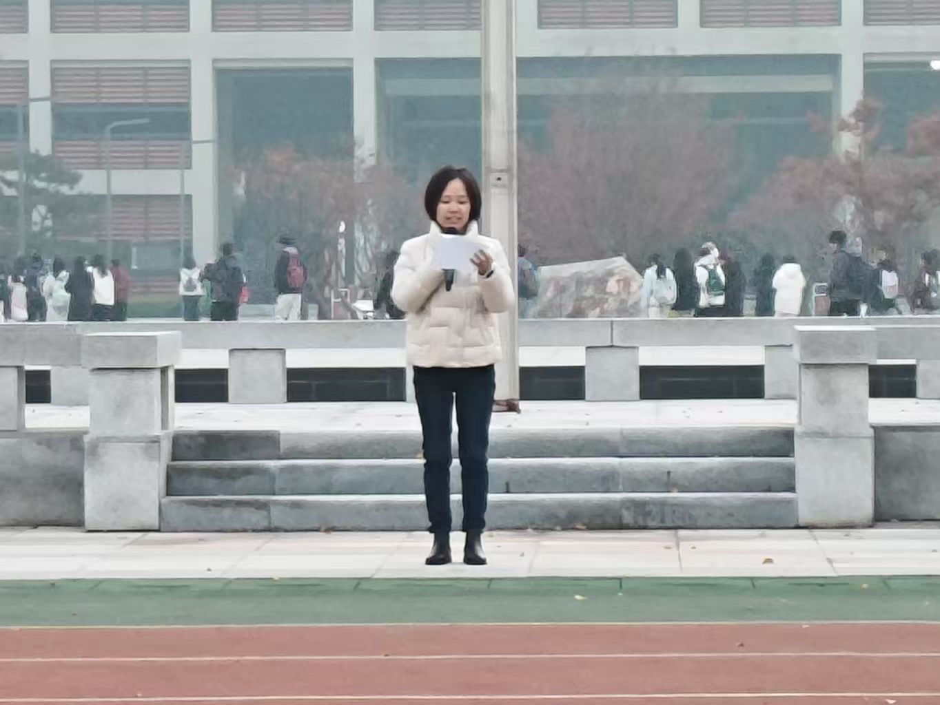 随着晨雾散去,升旗仪式正式开始。国旗护卫队迈着强劲有力的步伐入场,在激昂的国歌声中,五星红旗冉冉升起。随后,教育与心理学院副院长马君莉发表相关讲话,呼吁同学们用积极健康的心态去感受生活,面对生活,最后给予了全体学生美好的祝愿。最后,学生代表詹春宇带领同学们宣誓,号召同学们保持良好心态,以昂扬向上的姿态奋斗人生。