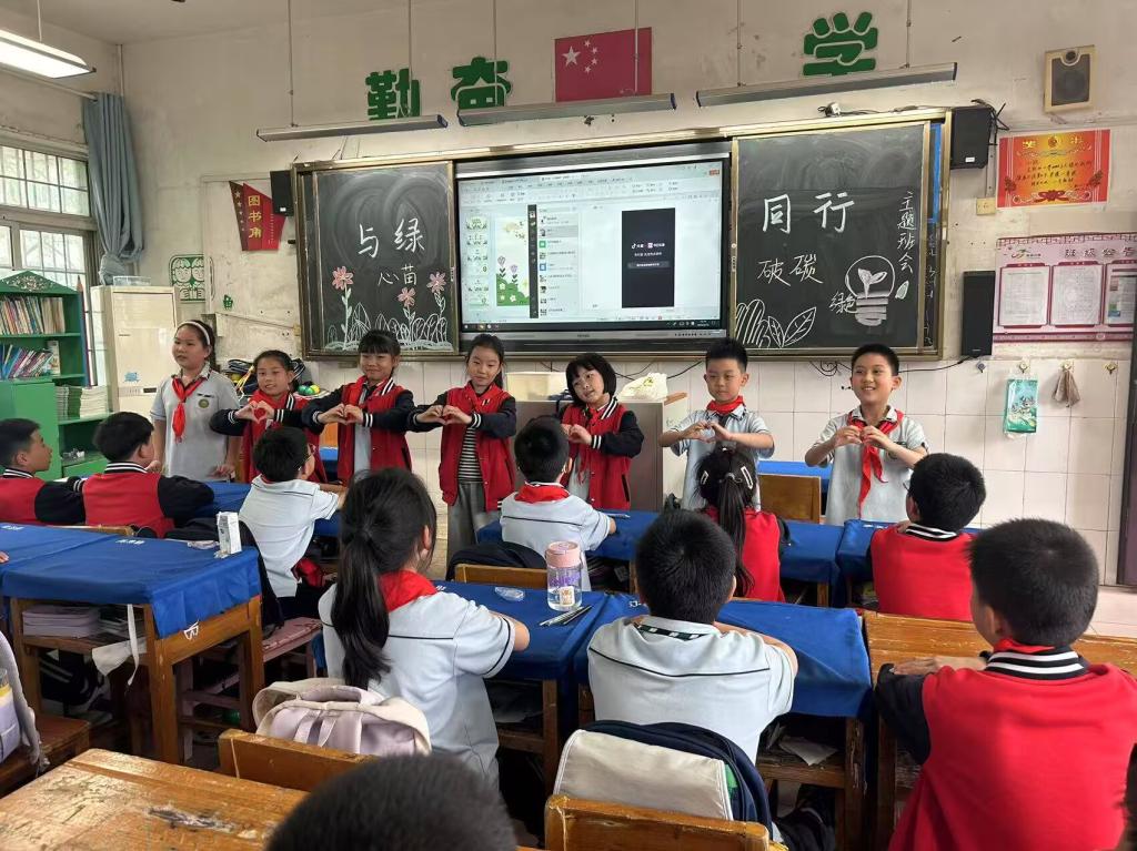 本网讯(通讯员 沈华燕)4月18日上午,与绿同行微光志愿服务队在荆州小学城中校区一年级至六年级共12个班级开展了“心舞碳踪Disco”创意手势舞活动,吸引了500余名师生热情参与,为“心苗破碳”系列活动画上了圆满句号。本次活动通过“艺术+低碳”的创新形式,以沉浸式美育深化低碳理念,让生态文明意识随着韵律融入童心,为学生们打造了一场可感知、可参与、可延续的绿色成长仪式。