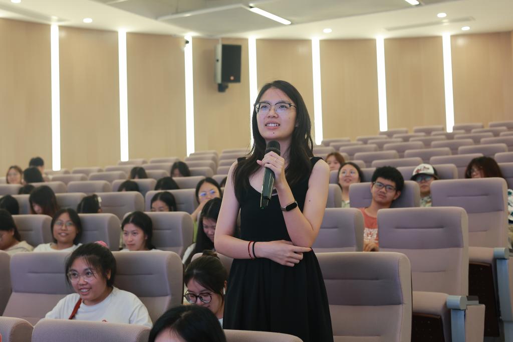 邱霞从“如何打造安全且富有生机的幼儿园环境”“怎样提升幼儿团队协作”“如何平衡教师引导与幼儿自主性”三个问题切入,从实践角度详细解答。她从幼儿园环境与教育的关系、环境创设六大原则、环境功能与创设差异性三个方面深入浅出的阐释了幼儿园环境的教育价值,指出幼儿园环境是“教育有机体”“动态教科书”,要通过精心规划和功能分区构筑成长场域。互动环节,她带领学生将普通纸箱转化为教育资源,探索创新路径。她寄语学子:怀揣教育热忱,为儿童搭建自由探索的“支架”。