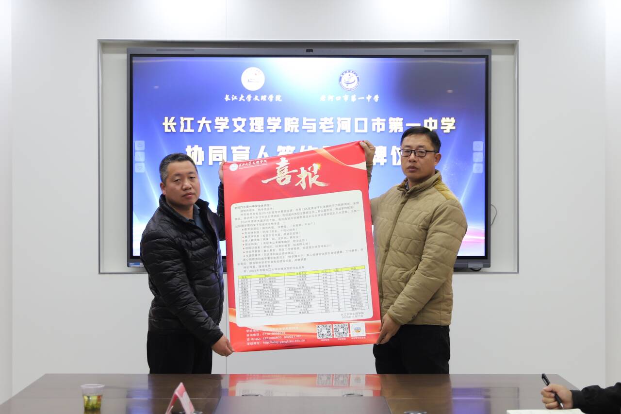 (通讯员 图/文 李嘉谊)为进一步探索学院与高中协同育人机制,加强双方在人才培育方面的有效衔接与合作,12月2日至3日,校领导院长助理曹骥带队,招生处、学生工作部、教育与心理学院相关负责人一行赴老河口市第一中学开展“协同育人基地”共建合作交流,签署共建协议,举行授牌仪式。