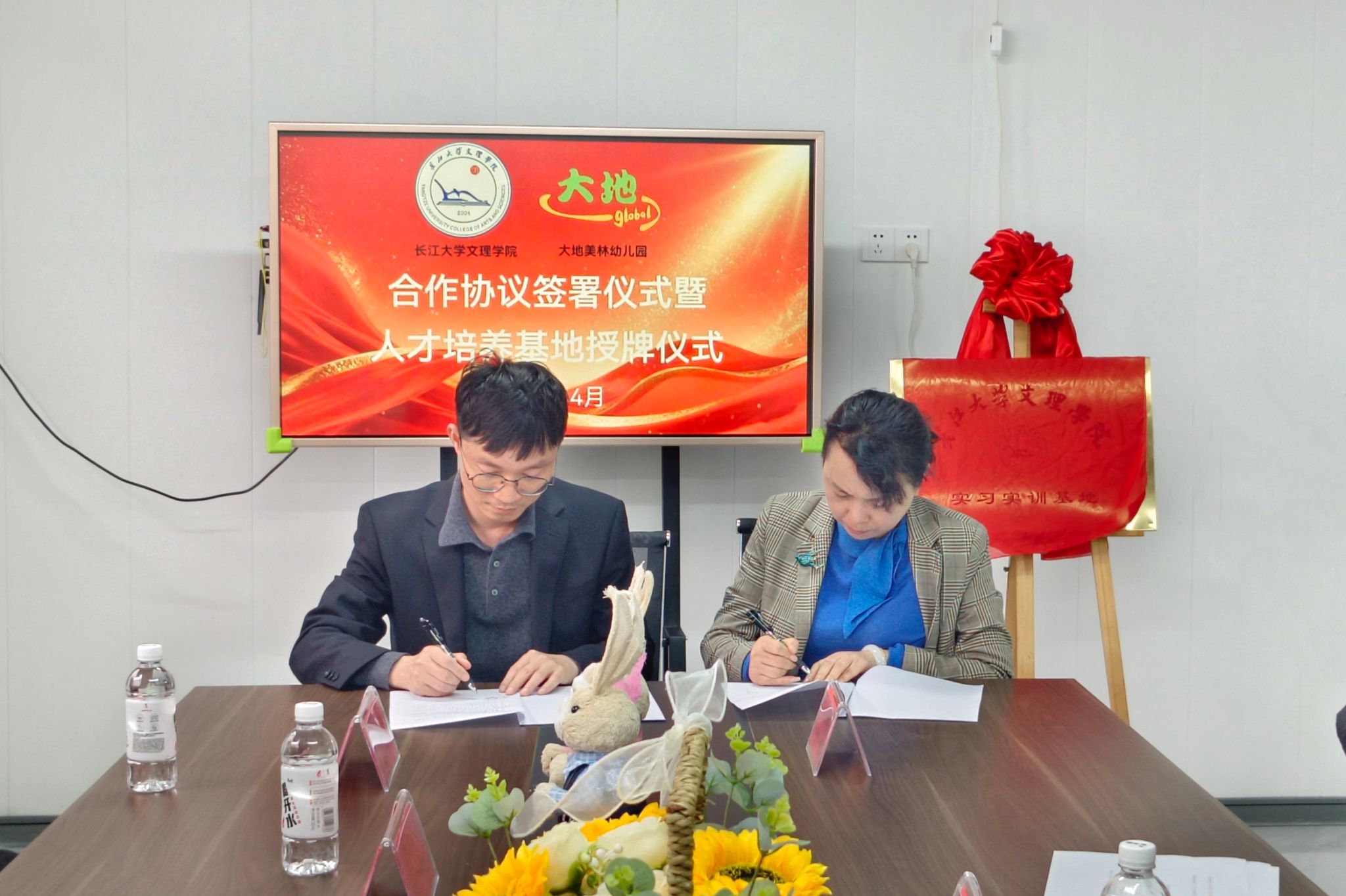 本网讯(通讯员/李嘉谊)4月22日,教育学院与荆州区大地美林幼儿园共建教育实践基地签约授牌仪式在幼儿园内举行。教育学院院长徐霄、副院长马君莉及教师代表,荆州区大地美林幼儿园校董刘希、园长黄云环等共同出席。