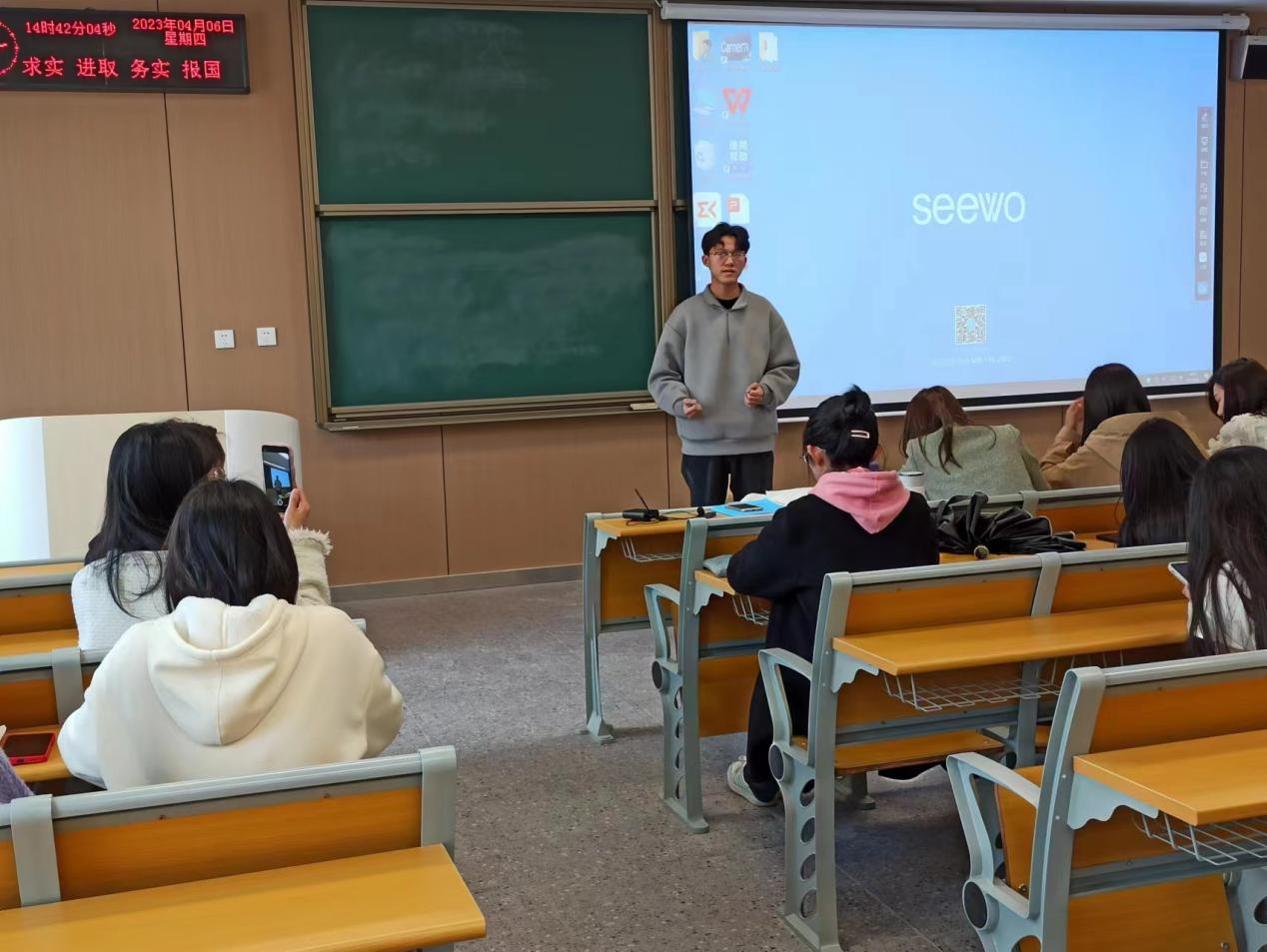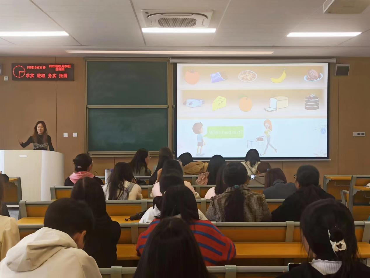在朗读(朗诵)与即席演讲项目中,参赛学生先进行朗诵环节,随后评委老师现场给出演讲题目,学生稍作准备后开始即兴演讲。即兴演讲环节不仅考验学生的语言组织能力,也考验学生的应变能力。同学们在评委老师的提问中交出了一份份满意的答卷,赢得台下阵阵热烈的掌声。在教学技能项目中,参赛选手把自己精心制作的PPT课件展示在大屏幕上,用流畅的语言和大方得体的肢体动作展开授课。台下观摩的同学配合参赛者积极互动,认真回答问题。