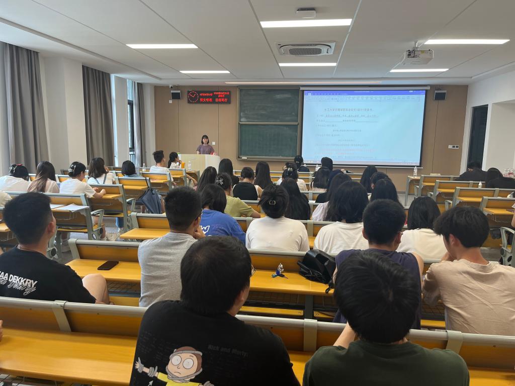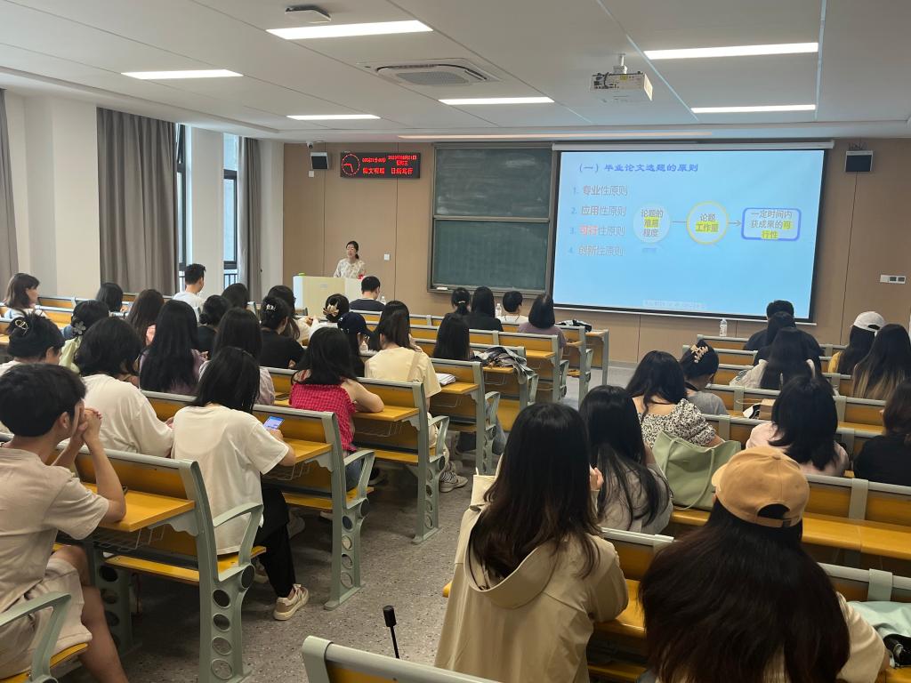 陈莎介绍了本届毕业论文的导师名单及分配情况,结合论文写作和教育部论文抽检要求,强调指导老师与学生之间要保持紧密联系和有效沟通,确保毕业论文全过程保质保量落实到位。随后,徐文庆老师围绕选题-文献检索-开题报告等方面,介绍了选题要求及常见问题、文献检索的专业网站和检索方法,并结合实例重点讲解了开题报告的各个部分的内容及写作要求。骆飞莉老师也结合毕业论文模板向学生讲解了格式要求,强调写作规范。