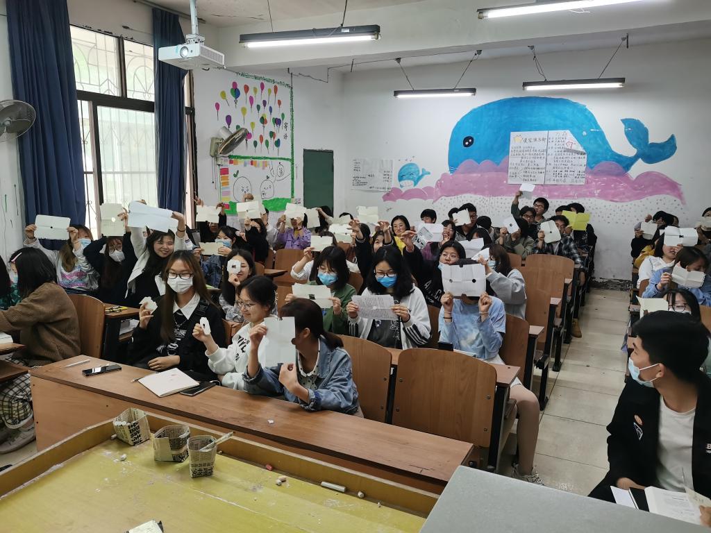 针对同学们在人际交往中的困惑和人际冲突,陈莎通过撕纸游戏引出人际沟通在解决人际冲突中的重要作用,让同学们更好地理解了“有效沟通=沟通意愿+沟通技巧”。