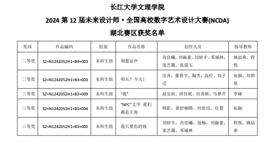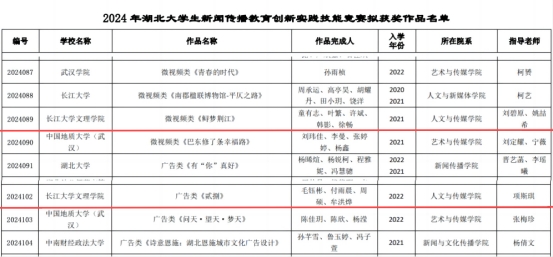 本网讯(通讯员 姚喆希)新学期,新气象。近日,从赛事组织方获悉,人文与传媒学院学子在湖北大学生新闻传播教育创新实践技能竞赛、全国高校数字艺术设计大赛中成绩优异,获二等奖4项、三等奖3项,共35人次获奖。