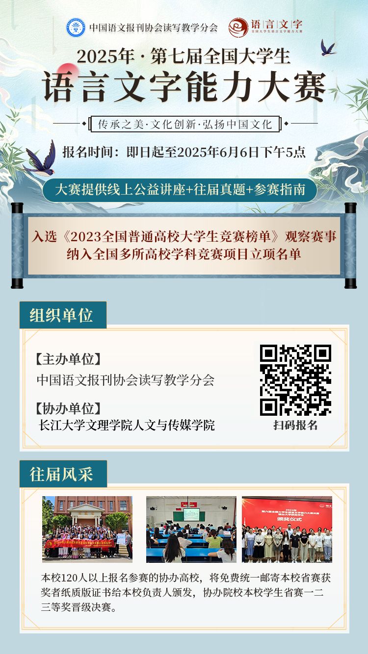 为贯彻落实《中华人民共和国国家通用语言文字法》等文件,推广普及和规范使用国家通用语言文字,传承弘扬中华优秀语言文化,提高大学生语言文字规范使用水平,增强规范使用意识,促进语言文字教、学、测协调发展,中国语文报刊协会读写教学分会现已面向全国大学生举办2025年第七届全国大学生语言文字能力大赛。yl7703永利集团人文与传媒学院作为本次大赛协办单位,负责组织本校学生参加本次大赛。
