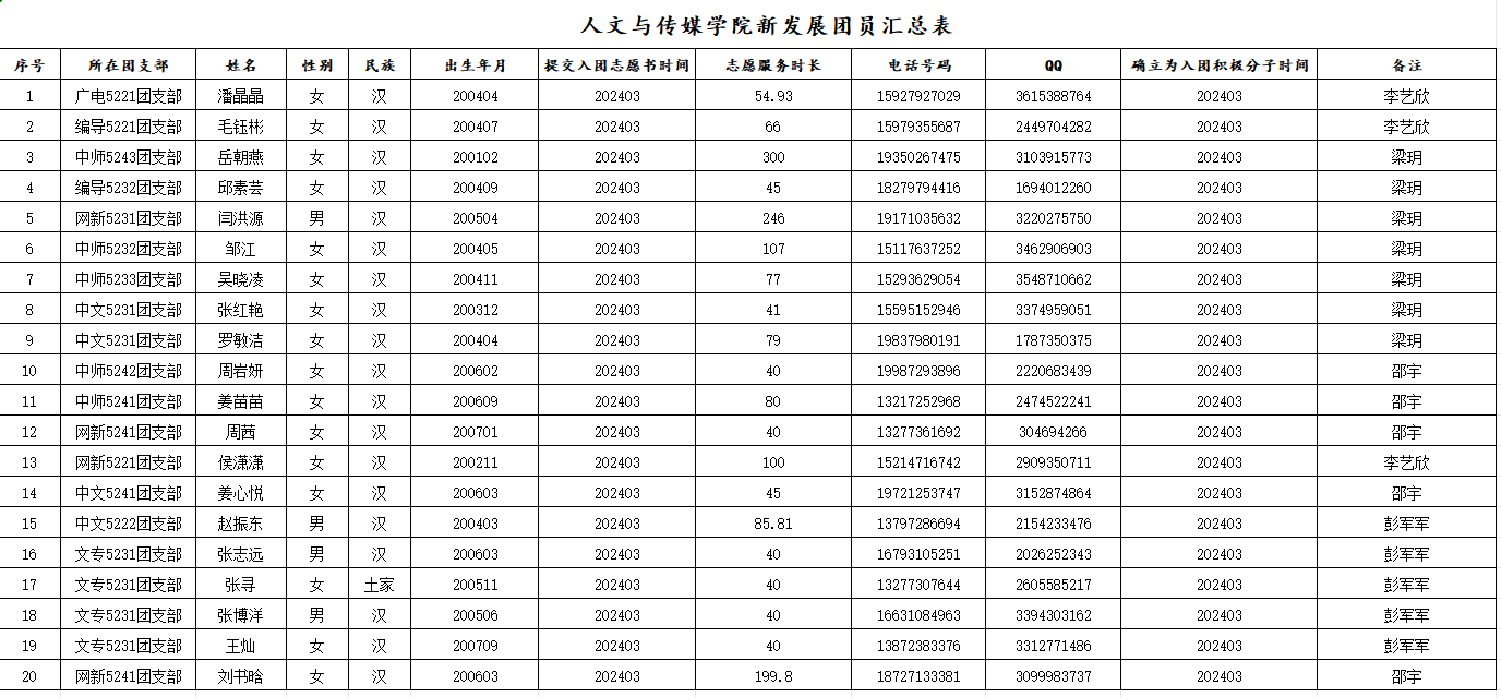 为进一步规范共青团管理工作,切实加强团的自身建设,根据《关于加强新形势下发展团员与团员管理工作的意见》、《中国共产主义青年团发展团员工作细则》、《yl7703永利集团关于2025年补充新发展团员的通知》等文件精神,按照“坚持标准、控制规模、发挥作用”的总要求,经各团组织评选,团总支审核,拟推荐潘晶晶等20名同学为新发展团员(见附件),特在全院范围内进行公示。