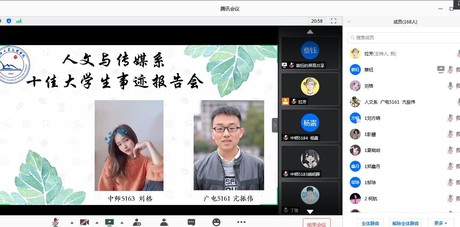 本网讯(学生记者 郭念)6月12日下午,人文系举办十佳大学生事迹线上报告会,学院第五届十佳大学生刘格、亢振伟通过腾讯会议形式分享了自己的心路历程,并向学弟学妹们表达了诚挚的祝福。