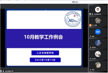 (本网讯 通讯员陈晨)10月15日晚19:30,人文与传媒学院在腾讯会议召开了十月份教学工作例会,人文与传媒学院院长罗勋章、党总支书记刘磊、副院长关莉红、教学办工作人员以及全体专任教师参加会议。