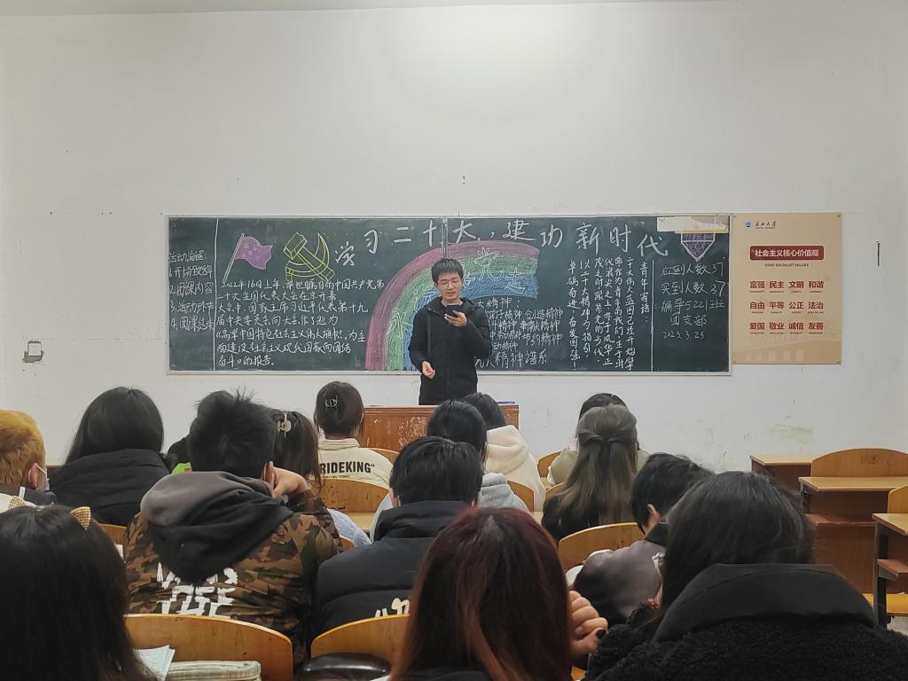 本网讯(学生记者 潘晶晶)3月23日,人文与传媒学院各班开展“学习二十大,奋进新时代”主题团课,本次团课旨在学习贯彻党的二十大精神,牢牢把握时代风向,在全面建成社会主义现代化国家新征程上,走好新一代人的长征路。