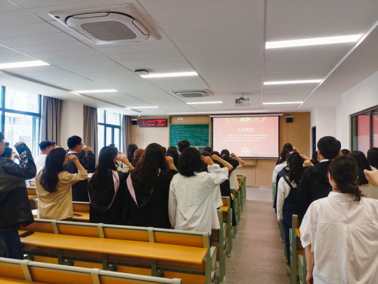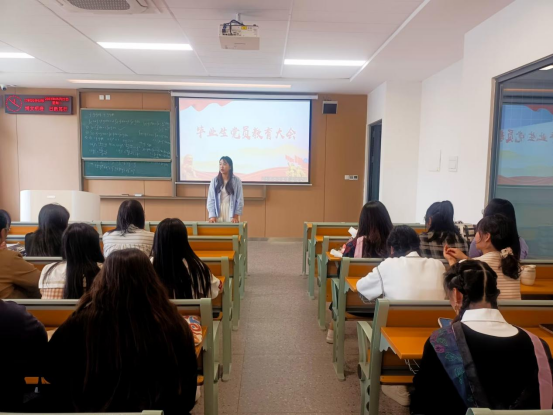 大会开始,雷昕带领全体毕业生党员在党旗下郑重举起右手,重温入党誓词,铿锵有力的声音表达了对党的无限忠诚。会上,雷昕向全体毕业生党员介绍了离校工作管理方面的安排,使毕业生党员清楚地了解到党组织关系的转接流程。最后,两位老师向各位毕业生党员送上寄语:要始终保持昂扬自信的斗志、要始终保持党性、要多与老师进行沟通联系,希望同学们不忘入党初心,牢记党员使命。