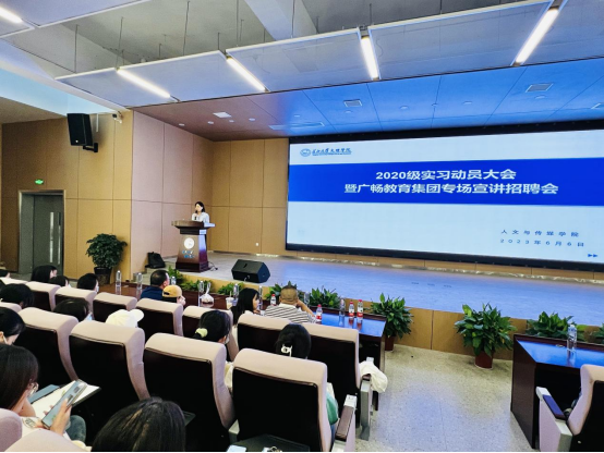 (通讯员 胡慧)6月6日晚,人文与传媒学院在教学楼B-112学术报告厅召开2020级实习动员大会暨广畅教育集团专场宣讲招聘会。人文与传媒学院党总支书记李成军、常务副院长关莉红、党总支副书记雷昕、相关班级实习指导老师、辅导员和全体2020级学生参加会议,会议由中文教研室主任刘佳主持。