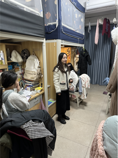 人文与传媒学院党总支副书记雷昕带领全体辅导员及班主任深入学生宿舍进行走访交流,实地了解学生在宿舍的学习、生活、心理等情况。在走访中,老师们对同学们的宿舍设施、用电、防火等安全情况进行摸排,全力排查各类安全隐患,同时勉励大家要养成良好的学习、生活习惯。