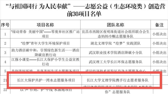 人文与传媒学院携手行志愿者服务队凭借在生态环境志愿服务领域的出色表现和扎实的工作基础成功取得入营资格(荆州市唯一入营项目)。经过为期3天的集中培训、项目答辩,携手行志愿服务队主持的“长江大保护共护一湾水”志愿服务项目从参加本次创造营的60个生态环境类项目中顺利突围进入前30强。