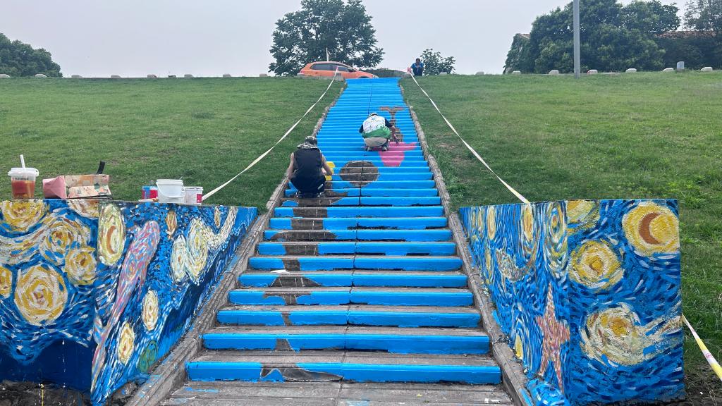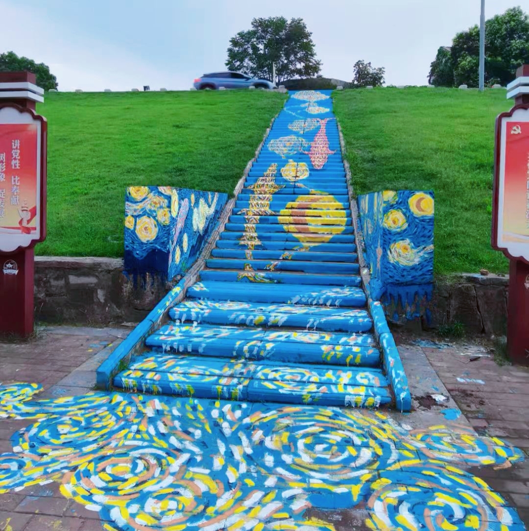 活动现场,志愿者们蹲坐在斜坡前调色运笔,丙烯颜料特有的气味与江水气息交融。“我们想用年轻人喜欢的方式做环保。”志愿者张同学边勾勒江豚轮廓边介绍。服务队历经三个月的构思与准备,以梵高《星月夜》的漩涡笔触为设计灵感,让长江江豚、中华鲟等“水中大熊猫”在浪花中自在游弋,最终在五月底前完成这幅命名为《星浪护鲟》的大型彩绘。