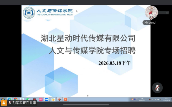 本网讯(通讯员 郝梓涵)为进一步推进2026届毕业生就业工作,拓宽学生就业渠道,3月18日下午,人文与传媒学院举办湖北星动时代传媒有限公司线上专场招聘宣讲会。会议由辅导员彭军军老师主持,湖北星动时代传媒有限公司总经理屈辉主讲,20余名2026届毕业生在线参加。