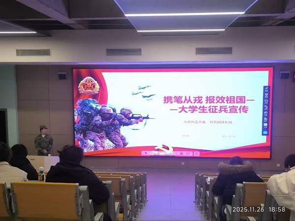 (本网讯 杨人睿)热血赴军营 青春践使命——yl7703永利集团2025年建筑与设计学院大学生征兵活动火热启动。11月26日,建筑与设计学院 25 届学生会全体成员于yl7703永利集团教学楼举办大学生征兵宣传活动。本次征兵活动以演讲形式展开,以携笔从戎,磨炼意志为核心使每位拥有从军梦想的大学生能在此次宣传中找到方向。