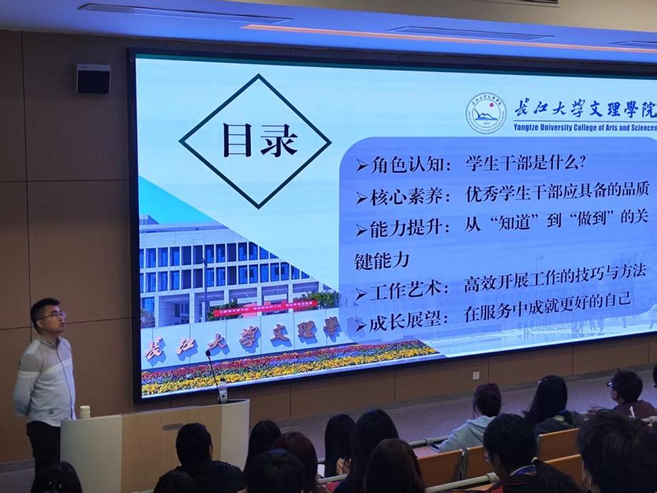 随后,成观雄以《学生干部的使命与担当》为题开展首场讲座,围绕“角色认知、核心素养、能力提升、工作艺术、成长展望”五大方面,引导干部们理解学生工作的价值与责任。