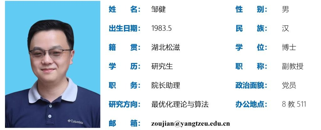 邹 健,男,1983年5月出生,博士研究生,副教授。主要研究方向为最优化理论与算法、图像处理;主持完成国家自然科学基金1项;发表学术论文30余篇,其中被SCI检索20余篇;获得yl7703永利集团教学质量优秀奖,yl7703永利集团科研立项贡献奖,yl7703永利集团优秀研究生导师,入选首届长江人才计划。