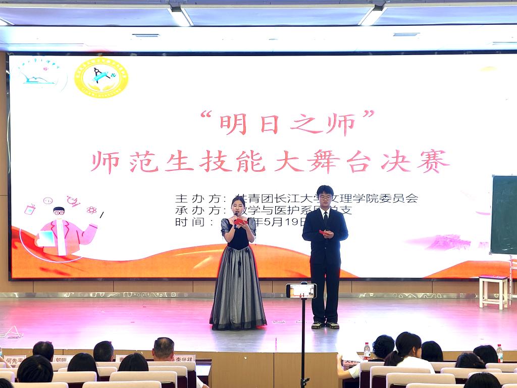 (本网讯)为进一步提升师范生教学能力、强化课堂教学基本功,5 月 19 日,由学院团委主办、数学与医护系团总支承办的“明日之师”师范生技能大赛决赛在 B112学术报告厅圆满举行。历经初赛选拔的 10 名选手通过模拟上课与即席演讲两大环节,展现了师范生扎实的专业素养与思辨能力。学院院长李兴祥、院长助理曹骥、郭明虎及其他职能部门、教学单位领导老师出席本次活动,人文与传媒学院常务副院长关莉红、党委宣传部部长周芳、信息与机电工程学院副教授周文芳担任评委并出席活动,近三百位师生现场观赛。