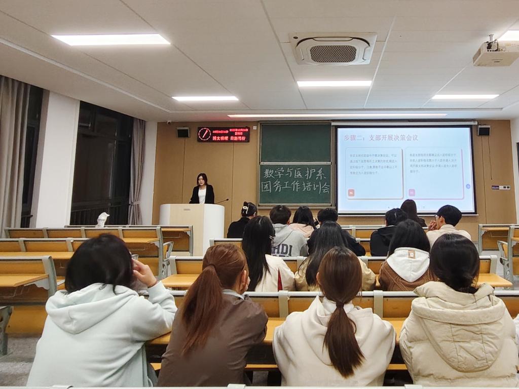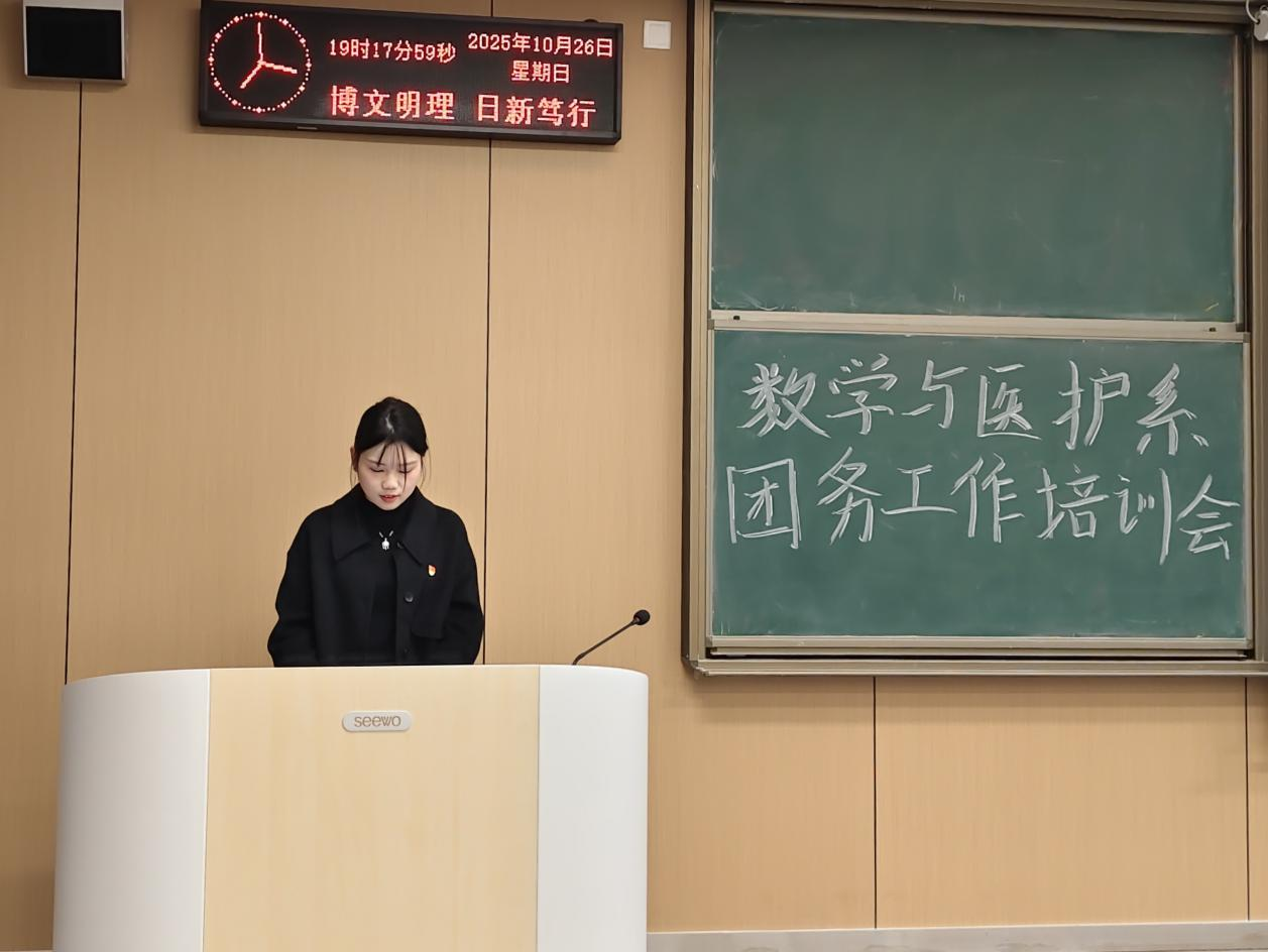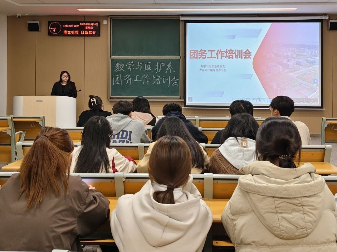 本网讯(见习记者刘金娜)为深入贯彻落实习近平总书记关于青年工作的重要思想,进一步筑牢团的基层组织根基,着力增强团支部工作的规范化水平和高效执行能力,数学与医护系于10月26日19:00在教学楼A-410教室开展团委工作培训会,本次会议由数医系学生会团总支副书记陈怡帆主持,参会人员有数医系党总支副书记燕梦蝶、优秀团支书代表阮佳莹、沈诗琴、甄若彤,2025级各班团支书及学生会组织部全体成员。