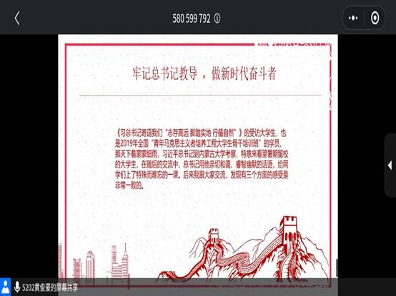 主持人带领同学们研习《习近平与大学生朋友们》,从中感悟习近平总书记对青少年的关怀并号召同学们做新时代的奋斗者,引导同学们在青年与时代共奋进的历程中收获感悟、汲取力量,在思想成长、专业学习与社会实践方面融合发展。习近平总书记的谆谆教诲让同学们感触颇深,并且同学们表示会牢记习近平总书记的教导,勇于开拓创新,做有锐气的新时代大学生。