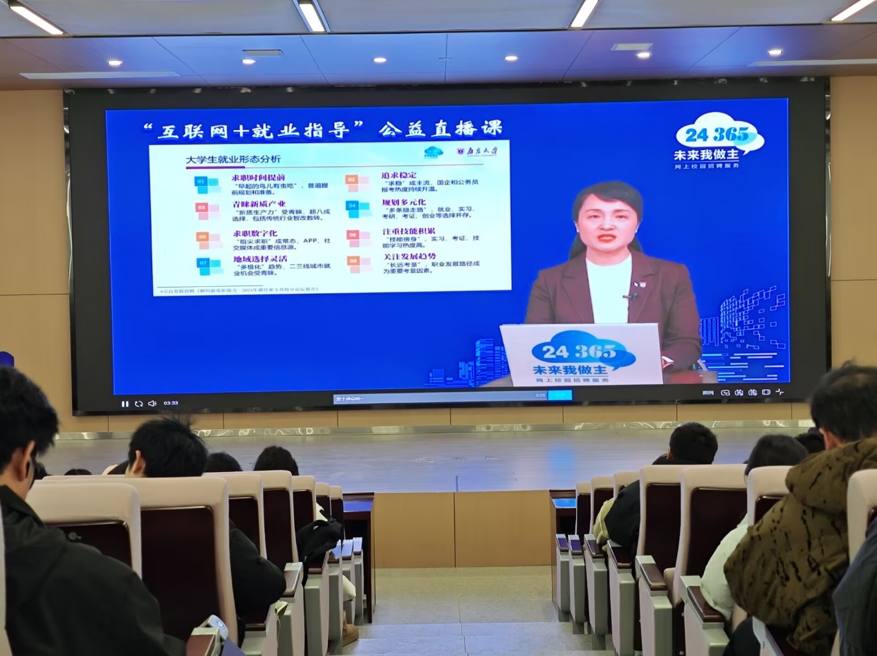 本网讯(见习记者崔雨欣) 为帮助学生更好地规划职业生涯,提升就业竞争力,数学与医护系于3月2日组织学生集中观看了教育部“互联网+就业指导”公益直播课。