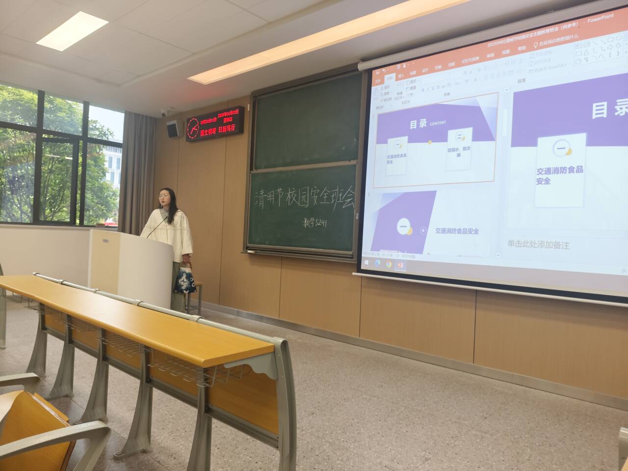 班会上,班主任特别提醒同学们,清明节是我国传统的祭祖节日,要注意遵守公共秩序,文明祭祀,不乱丢垃圾,保护环境。同时,假期出行要注意交通安全,遵守交通规则。希望同学们重视安全问题,提高自我保护能力,度过一个安全、愉快的清明节假期。