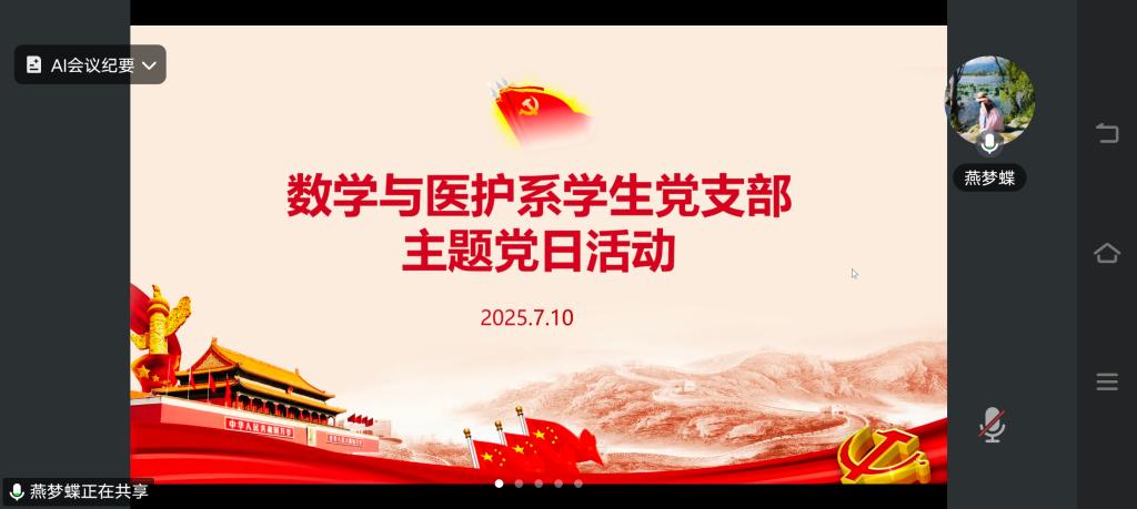 本网讯(通讯员 崔润芳)7月10日19:30,数医系学生党支部在腾讯会议开展7月份支部“主题党日”活动,活动由数学与医护系学生党支部书记燕梦蝶主持,支部全体党员参加。