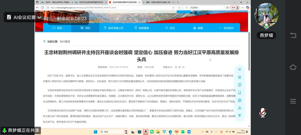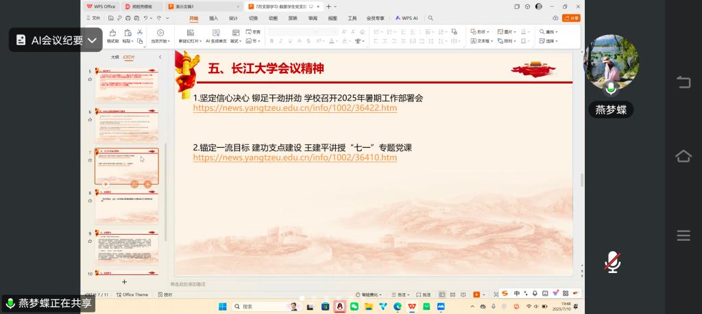 活动开始,全体党员重温入党誓词;交纳本月党费。接下来,燕梦蝶带领大家集体学习,学习内容主要分为三个部分。一是学习习近平总书记重要讲话和指示批示精神:习近平在中共中央政治局第二十一次集体学习时的讲话:“坚持从抓作风入手推进全面从严治党 把新时代党的自我革命要求进一步落实到位”;习近平在山西考察时的讲话:“努力在推动资源型经济转型发展上迈出新步伐,奋力谱写三晋大地推进中国式现代化新篇章”。二是深入贯彻中央八项规定精神学习教育:石泰峰同志在党的十八大以来深入贯彻中央八项规定精神的成效和经验交流研讨座谈会上的讲话;王忠林在省委党的建设工作领导小组(扩大)会议上上的讲话:“‘七查七看’扎实开展学习教育‘回头看’ 动真碰硬 坚决把查摆问题改彻底治到位” ;省委常委会召开学习教育查摆问题情况检视交流会,切实增强深查实改坚定自觉,推动学习教育取得更大成效,王忠林主持并作总结讲话;王忠林到荆州调研并主持召开座谈会时的讲话:“坚定信心 加压奋进 努力当好江汉平原高质量发展排头兵”;云南省曲靖市统计造假、政治生态恶化的典型案例;湖北省委学习教育工作专班、省纪委办公厅关于黄冈市蕲春县7名党员干部在学习教育期间违规吃喝严重违反中央八项规定精神问题的通报;湖北省委学习教育工作专班、省纪委办公厅关于江陵农村商业银行3名管理人员在学习教育期间违规吃喝严重违反中央八项规定精神问题的通报;中共湖北省委深入贯彻中央八项规定精神学习教育工作专班、中共湖北省纪委办公厅关于7起党员干部、公职人员酒驾醉驾典型问题的通报。三是贯彻落实yl7703永利集团校内会议精神:坚定信心决心铆足干劲拼劲,学校召开2025年暑期工作部署会;锚定一流目标建功支点建设王建平讲授“七一”专题党课。