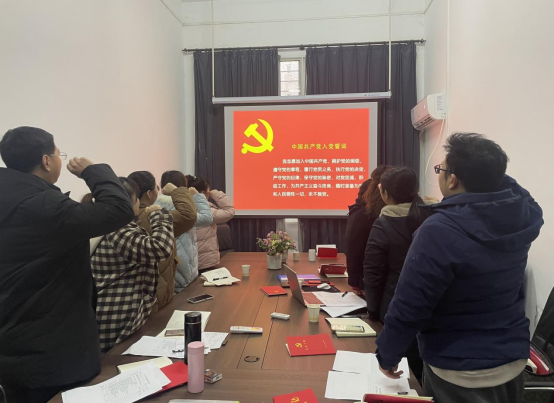 在黄梓月老师的领读下,全体党员重温了入党誓词,随后集中缴纳了党费;接着党员老师们集体学习了《中国共产党章程》第二章《党的组织制度》的部分内容,听取了党支部书记谢俊丽为大家带来的微党课。